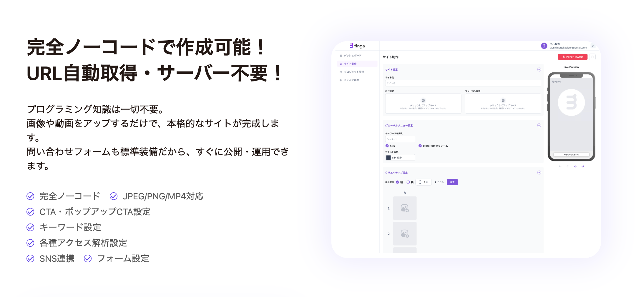 中小企業・個人事業主・デザイナー向けに、スマホ特化のスワイプ型LP(ランディングページ)を誰でも・すぐに・直感的に作成できるクラウドサービス「finga」 のβ版をリリースしました。