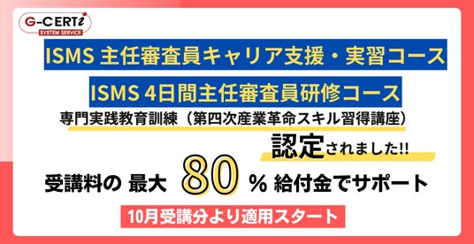 株式会社GCERTI-JAPAN(本社:大阪府大阪市中央区、代表取締役:一山 大介)の提供するISO/IEC 27001(ISMS)主任審査員養成講座が、このたび厚生労働省指定講座「専門実践教育訓練給付制度」の認定を受けました。本制度の活用により、ISMS(情報セキュリティマネジメントシステム)の国際規格であるISO/IEC 27001に関する主任審査員養成講座の受講料の最大80%の支給を受けることが可能です。デジタル化の進展で需要が高まる情報セキュリティ分野での“定年のないセカンドキャリア”といえるISO審査員としての働き方を支援します。給付金対象となるコースは2025年10月より開講します。