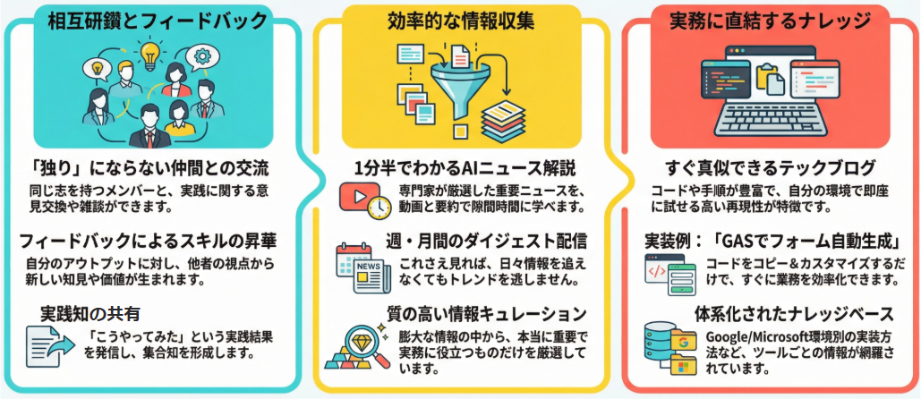 本コミュニティは、大手企業のDX・経営企画リーダーが実務上の課題を解決し、互いの知見を「集合知」として蓄積するプラットフォームです。以下の3つの柱を中心に、実務に即応した価値を提供します。