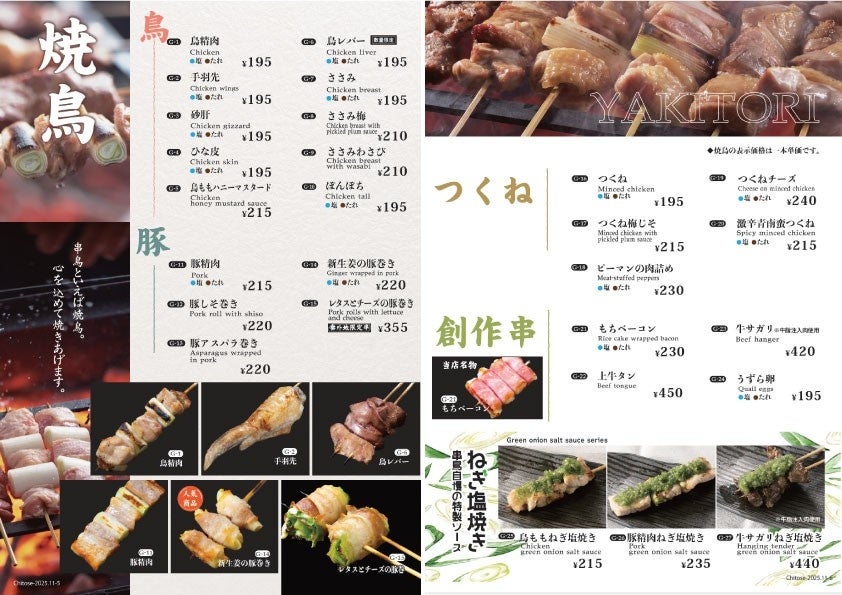 千歳で始まる新しい串鳥は、原始焼きを始め、旬の海鮮や野菜など素材本来の旨みを炭火の技で引き出すこれまでにない店です。進化した串鳥をご堪能ください。