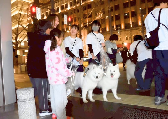 真っ白な大型犬サモエド複数匹連なって街を歩く光景は強い視覚的インパクトがあり、通行人との自然なコミュニケーションが生まれるきっかけとなりました。