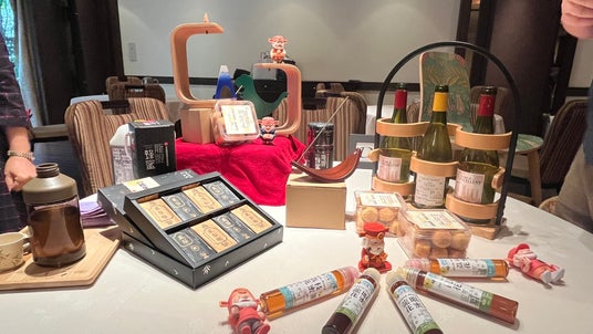 嘉義の物産、その多彩な魅力--国際賞を受賞した「蜂世界」のスティック蜂蜜や、「青啟國際」のプレミアム鳳梨酥(パイナップルケーキ)に加え、台湾らしさ溢れる「福神フィギュア」や木工芸品が一堂に展示され、現地のバイヤーに嘉義ブランドの多様性をアピールしました。