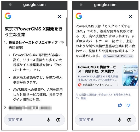 Googleでの検索時の、AI による要約(AI Overviews)事例。(正確を期するため、ブラウザをシークレットモードでVPN接続の上実証。※検索ワード:東京 PowerCMS X 開発会社)