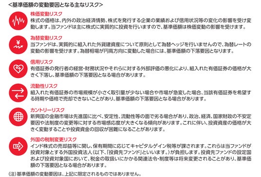 - インドの株式には、外国投資家の保有比率の制限があります。したがって、外国投資家の保有比率の状況によっては 運用上の制約を受ける場合があります。なお、インドの制度等は変更される場合があります。