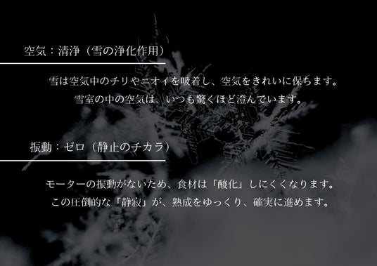 雪室の特徴:雪による空気の浄化作用と電気を使わないため振動も無し