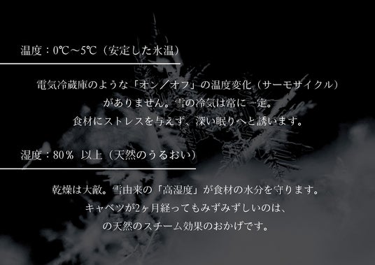 ■「雪室(ゆきむろ)」とは:古来から伝わる知恵と未来のテクノロジー雪室とは、冬に積もった雪を貯蔵し、その冷熱で温度0~5℃、 湿度80%以上の理想的な保存環境をつくる「天然の冷蔵庫」です。 当社はこの仕組みをコンテナ化することで、現代社会における以下の価値を実現しました。