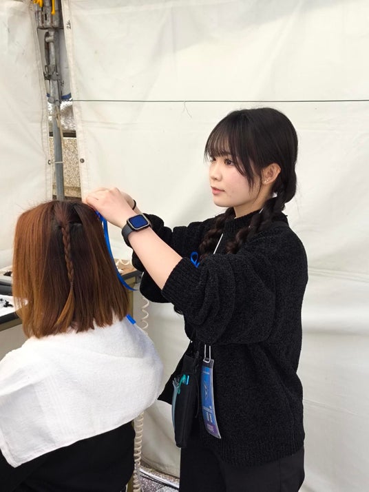 学生たちは、リボンやヘアピンを使った“チームカラーアレンジ”を中心に、それぞれの要望に合わせたスタイルを提案。スタジアムのワクワク感をさらに高める演出に貢献しました。