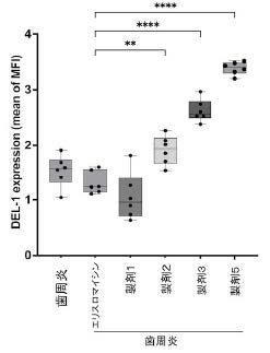 〆DEL-1誘導能評価 徐放製剤5投与後9日目におけるマウスの組織では、DEL-1 の発現量が有意に高く、強いDEL-1誘導能が認められました。