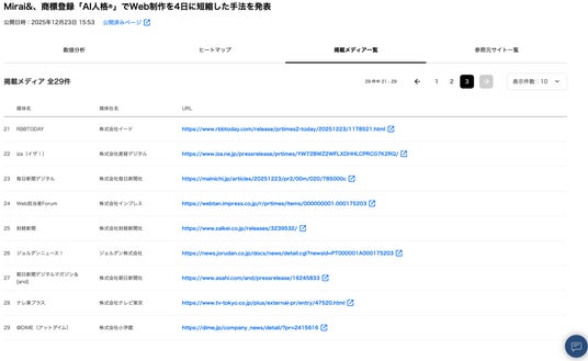 AI人格(R)プレスリリースのテスト配信が、TBS NEWS DIG、日経、NewsPicks、産経、朝日など29媒体への掲載を達成。PR全体平均1~3件を大幅に上回る結果を公開。