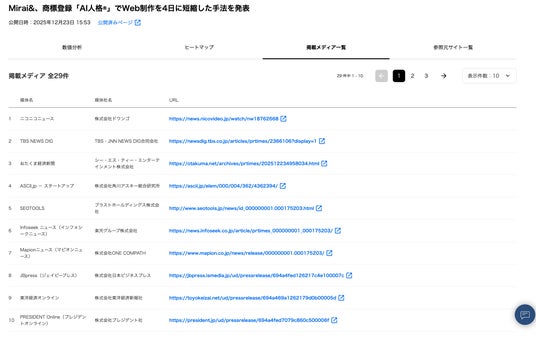PR TIMES経由の全体平均掲載数が1~3件であることを踏まえると、29媒体掲載はサービスの有効性を示す結果といえる。