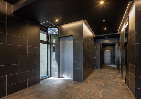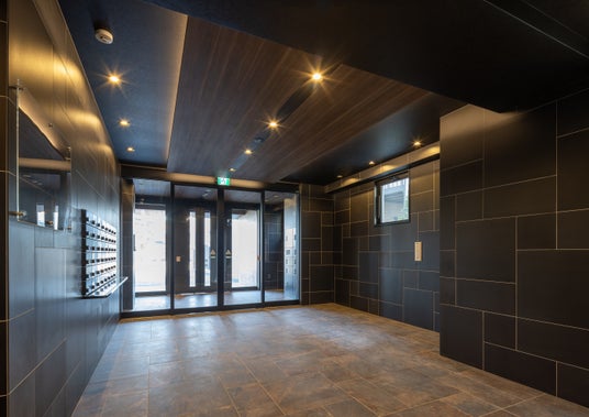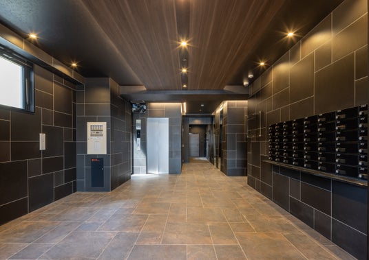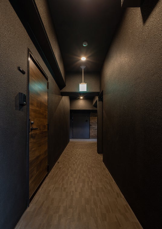 各住戸へと続く共用廊下は、マットな黒の質感で統一。余計な装飾を削ぎ落としたミニマルな空間に、木目調のドアがアクセントとして浮かび上がります。この実用的でありながらホテルライクな空間構成が、住まうことの誇りを日々鮮やかに彩ります。