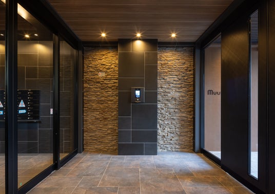 エントランスホールには、重厚な石目調のタイルと、温かみのある木目調の天井を採用。無機質な黒のパネルと、自然の風合いを感じさせる岩肌のような意匠壁が対比を成し、訪れる人を優しく、かつ格式高く迎え入れます。