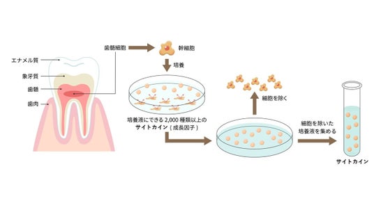 ヒト歯髄由来幹細胞を培養する過程で生じる上澄み液です。ALSの症状改善に寄与する可能性のある「神経栄養因子」を豊富に含み、神経保護や免疫調節作用を有しています。細胞そのものを移植しないため、簡便かつ安全性の高い次世代の再生医療として注目されています。