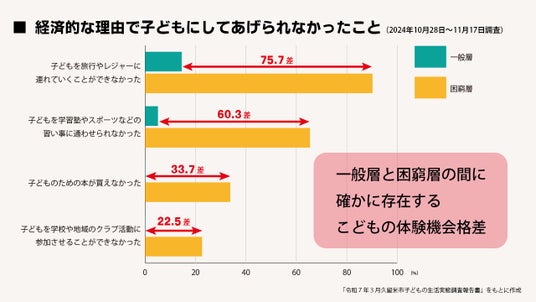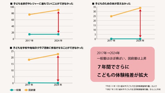 「久留米市子どもの生活実態調査報告書」(令和6年調査・令和7年3月発表)によると、「一般層」と「困窮層」の間でも経済的格差の拡大に伴いこどもの体験機会の格差も深刻化しています。
