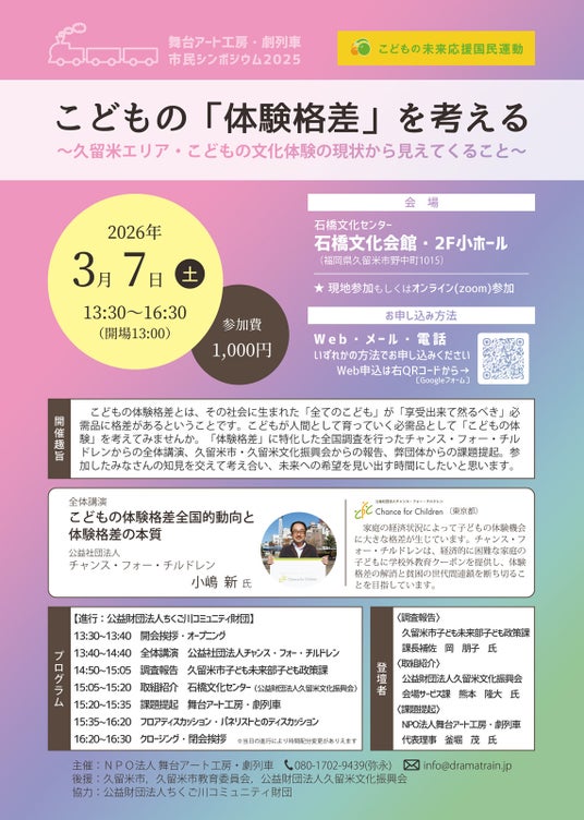 福岡県久留米市に拠点を置く人形劇チーム特定非営利活動法人舞台アート工房・劇列車が、「こどもの『体験格差』を考える」市民シンポジウムを3月7日に久留米市石橋文化センターで開催します。課題が可視化されにくい「経済的理由に起因するこどもの体験格差」を、チャンス・フォー・チルドレンによる講演と、久留米市子ども未来部子ども政策課、石橋文化センター((公財)久留米文化振興会)、(特非)舞台アート工房・劇列車からの報告で可視化する3時間です。