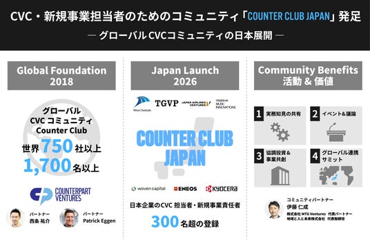 シリコンバレー発のベンチャーキャピタル Counterpart Ventures が展開する、CVC・新規事業担当者のためのコミュニティ「Counter Club Japan(カウンタークラブジャパン、以下 CCJ)」は、2026年2月23日の先行ローンチ以降、参加登録者数が300名に拡大し、日本国内におけるコミュニティ活動を本格化しています。