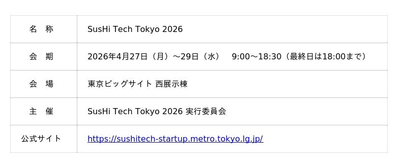 「SusHi Tech Tokyo 2026」は、アジアを代表するスタートアップ・エコシステムの祭典です。本イベントへの初出展を通じ、志を同じくするスタートアップ・投資家・企業・研究機関との接点を広げ、アジア展開を加速させます。
