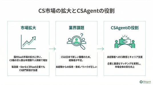 カスタマーサクセス(CS)特化の転職支援を行う株式会社CSAgent(代表取締役 宮野亮)は、2026年4月23日より、CS職への転職希望者向けの転職支援サービスを正式に開始いたしました。近年、サブスクリプションビジネスの拡大に伴い、顧客の成功を能動的に支援する「カスタマーサクセス」の重要性が急速に高まっています。CSAgentは、CS経験者はもちろん、セールス、サポート、マーケ職などの方々が専門性を活かしCS職へキャリアアップする「架け橋」となります。