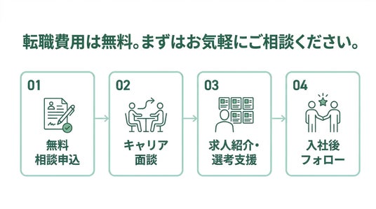 転職相談、キャリア相談はすべて無料です。具体的な求人情報の提供も可能です。