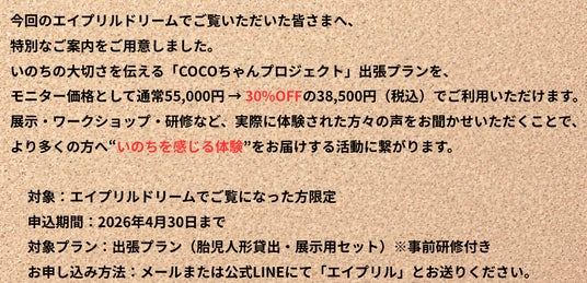 COCOちゃんプロジェクトは、胎児人形を通して「いのちを感じることの大切さ」を伝える活動です。