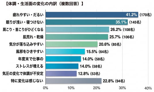 季節の変わり目に体調面で感じる変化を尋ねたところ、77.2%が何らかの体調変化を感じていると回答。頭皮と体調の両方で変化を感じている人は64.2%(265名)に達しました。