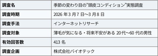 発毛・育毛の専門企業である株式会社バイオテック(本社:愛知県名古屋市)は、薄毛が気になる・将来不安がある20代~60代の男性413名を対象に「季節の変わり目の“頭皮コンディション”実態調査」を実施いたしました。
