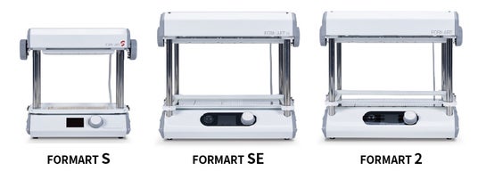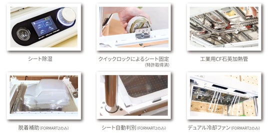 FORMARTシリーズは、卓上に設置できる真空成型機としてどなたでも簡単に業務用レベルの「型」を作ることができるのが特長です。FORMARTシリーズはさまざまな独自機能を持つため、成型不良率が低く、ご家庭や職場で安定した小ロット真空成形が可能となります。