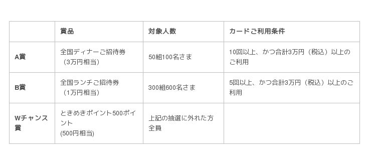 さらに、発行されたカードにて、2015年4月10日(金)までに下記カードご利用条件を満たした方に抽選で賞品をプレゼントいたします。抽選に外れた方にはWチャンス賞としてときめきポイント500ポイント(500円相当分)をプレゼントいたします。