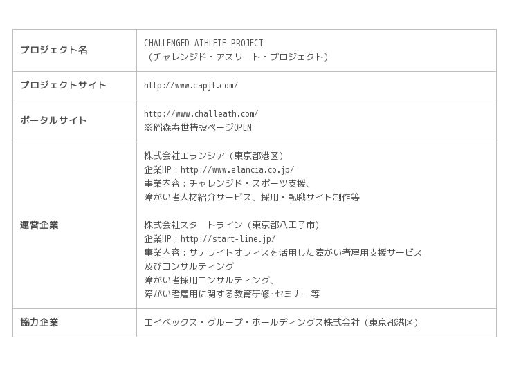 CHALLENGED ATHLETE PROJECTは、チャレンジド・スポーツ(※1)競技団体・協会様と、チャレンジド・スポーツを応援する企業様と一緒に、より多くのチャレンジド・アスリートが活躍でき、またチャレンジド・スポーツに対する認知度をより高めることをミッションとしたプロジェクトです。この度、平成28年2月13日に、チャレンジド・アスリート(※2)を応援するチャレアス公式マネージャーに、稲森寿世の就任が決定いたしましたのでお知らせいたします。