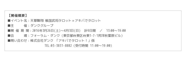 株式会社ダンク(本社:東京都台東区 代表・井上弘治)は、『天華舞翔 戦国武将タロット』の刊行記念イベントを企画。戦国武将とタロット占いを融合した新たな切り口のイベント「天華舞翔 戦国武将タロット×アキバでタロット」 を、3月26日から4月3日までの9日間開催します。