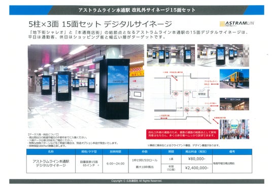 NTT西日本グループの株式会社広告通信社(本社:広島市中区、代表取締役社長:宇山 賢)は、広島高速交通株式会社(本社:広島市安佐南区、代表取締役社長:政氏 昭夫)の「アストラムライン本通駅」構内に広島市中心部では最大級となる15面セットのデジタルサイネージを設置し、広告販売を開始しました。