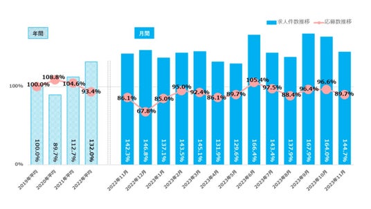 ※出典:マイナビ 「2023年11月度 正社員の求人件数・応募数推移レポート」