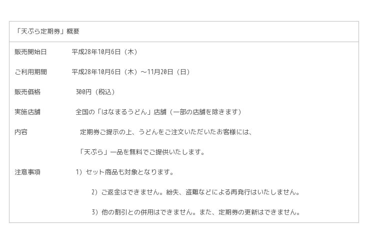 讃岐うどんチェーン「はなまるうどん」を展開する株式会社はなまる(本社:東京都中央区 代表取締役社長:成瀬 哲也、以下はなまる)は、10月6日(木)より全国の「はなまるうどん」店舗にて、うどんを注文したお客様に天ぷらを一品無料でお付けする『天ぷら定期券』を販売いたします。