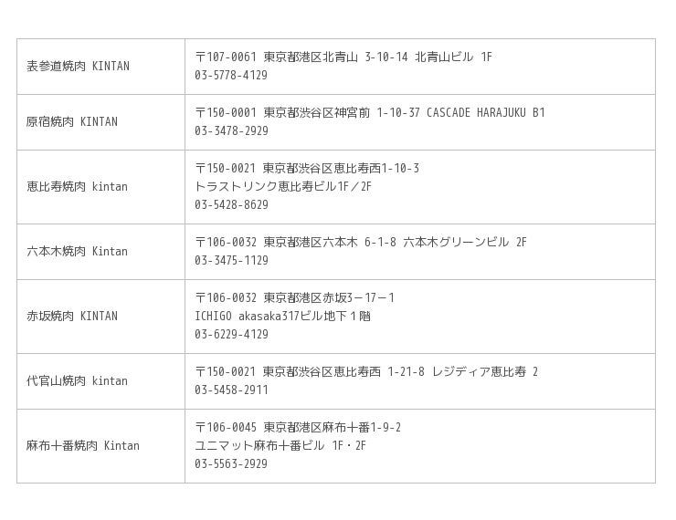 表参道焼肉 KINTAN、原宿焼肉 KINTAN、恵比寿焼肉 kintan、六本木焼肉 Kintan、代官山焼肉 kintan、赤坂焼肉 KINTAN、麻布十番焼肉 Kintan