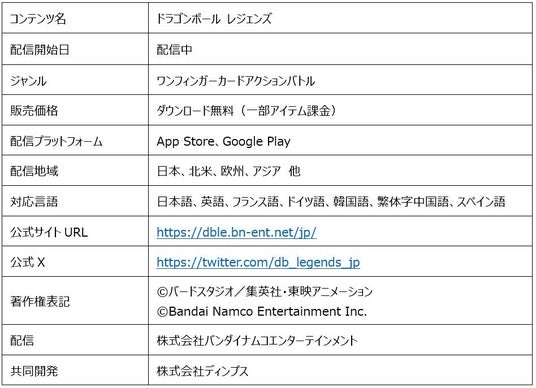 「ドラゴンボール レジェンズ」は、自ら育て上げたドラゴンボールのキャラクターを駆使し、全世界のライバル達とリアルタイム対戦を楽しめるスマホゲームアプリです。指1本で操作できる手軽さと、3Dグラフィックスとバトル中フルボイスの超ハイクオリティ仕様が特長。ゲームの主人公は鳥山明先生描きおろしのオリジナルキャラクターです。2024年4月には全世界で1億ユーザーを突破しました。