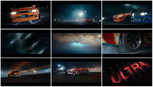 ゲーム内での「ULTRA」レアリティの特別な演出を想起させるモノクロの世界の中で、オレンジ色の「孫悟空」と青色の「ベジータ」をイメージした2台のスポーツカーが、お互いを追い越し合いながらドリフト。正面からぶつかるように交差すると、「超サイヤ人4 ゴジータ」カラーのスポーツカーが暗闇から現れます。目のようにも見えるヘッドライトを光らせると、煙を巻き上げながら猛スピードでドリフトする超サイヤ人4 ゴジータ号。赤いテールライトがドリフトの軌道に沿って伸びて行き、「ULTRA」の文字が浮かび上がります。