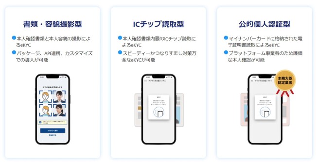 提供方法としては、書類・容貌撮影型、ICチップ読取型、公的個人認証型(JPKI)を展開しており、事業者様のサービスにマッチした方法を選択しご導入いただけます。