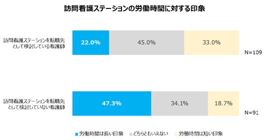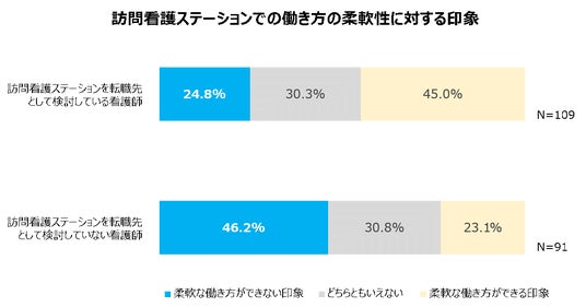 訪問看護業界の労働環境(残業の多さ、休日の多さ、働き方の柔軟性)の印象を聞いたところ、訪問看護ステーションを転職先として検討している看護師に比べ、転職先として検討していない看護師の方が労働環境に対する印象が良くないということがわかりました。