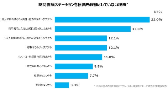 訪問看護ステーションを転職先候補として検討していない看護師の方に対してその理由を聞いたところ、「自分で判断することへの不安」が最も多く挙がりました。