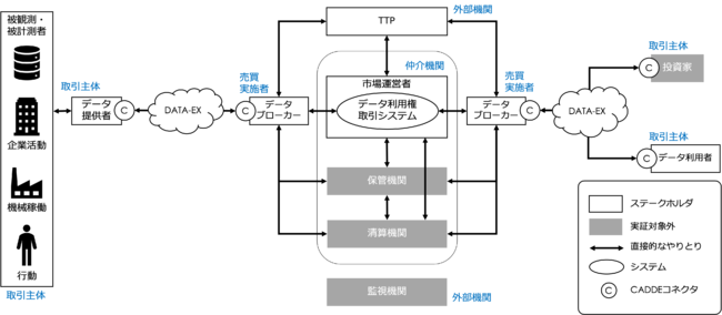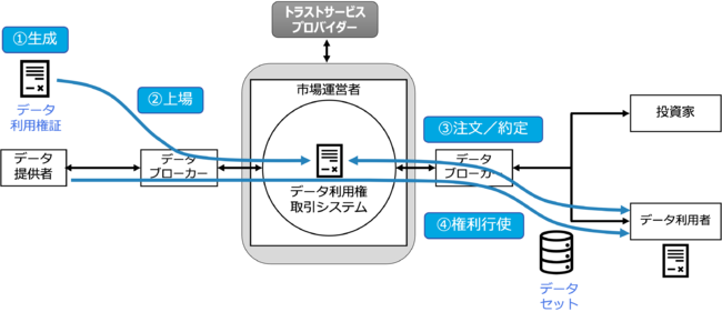 ■背景 エブリセンスは、データ保有者とデータの活用を希望する者を仲介し、売買等によるデータの取引を公平公正に支援する仕組みとして「データ取引市場EverySense Pro」を運営しております。「データ取引市場」とは、我が国が掲げるSociety 5.0やデータ駆動型社会の実現に寄与する社会インフラとして位置付けられ、一般社団法人データ社会推進協議会により、IEEE P3800として国際標準化に向けた検討が行われているものです。しかし、データ駆動型社会においてデータ流通を阻害する要因のひとつとして、無体物であるデータは一般的に日本の民法上の権利(所有権、財産権等)保護の対象外となることが挙げられます。そこで、データ保有者が第三者にデータを提供し、データを提供された者が、新たな経済活動に向けてそのデータを利用し財を得るという一連の営みにおいて、「データを利用する権利」を権利証書化し取引の対象とするとともに、信頼できる第三者機関(以下、「TTP」という。)によりその権利が保証される「データ利用権取引市場システム」を新たに開発し実証実験を行いました。