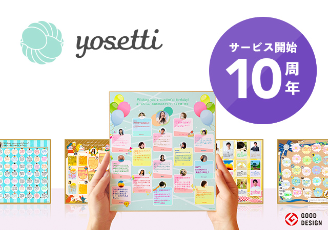 オンライン寄せ書きyosetti(ヨセッティ)は2012年からサービス提供を開始し、今年で10周年を迎えます。会員数約165万人、累計約65万件の寄せ書き作成実績を誇り、様々な贈答シーン等でご利用いただいてます。人気キャラクターとのコラボレーションなども含む200種類以上の豊富なデザインと、高品質な色紙印刷を最短で翌日に納品できるユーザー体験の良さが特徴です。