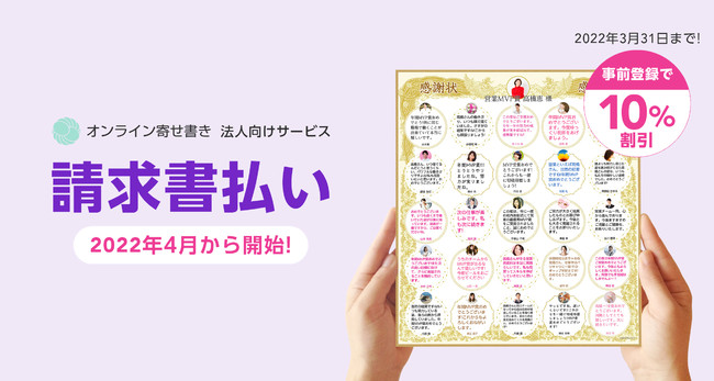 株式会社yosetti(東京都品川区、代表取締役:岡田 昇三)が運営するオンライン寄せ書きyosetti(ヨセッティ)は、2022年4月1日(金)より法人企業向けに「請求書払いサービス」を開始します。新サービスの開始を記念して、2022年3月31日(木)までの事前登録で10%割引になるキャンペーンを行います。