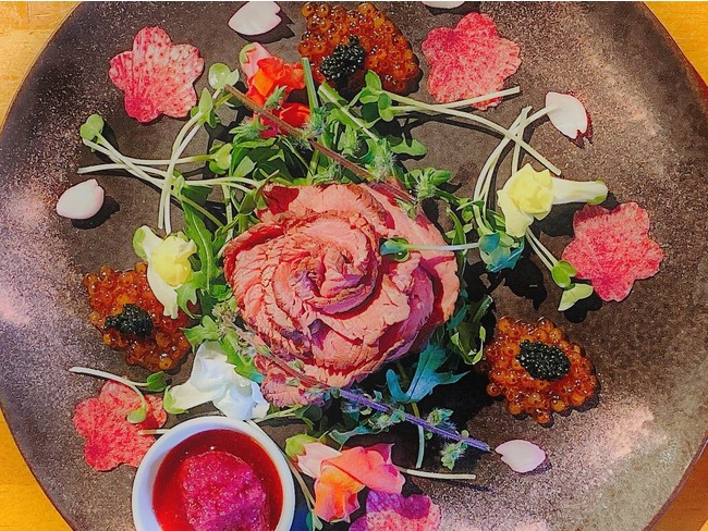 やわらかくジューシーな肉質と凝縮された旨味が堪らない当店で根強い人気を誇る自家製ローストビーフを花に見立ててアレンジ。いくらとキャビアを豪華に盛り付け、桜色の大根おろしを添えた、彩り豊かな春映えメニュー。