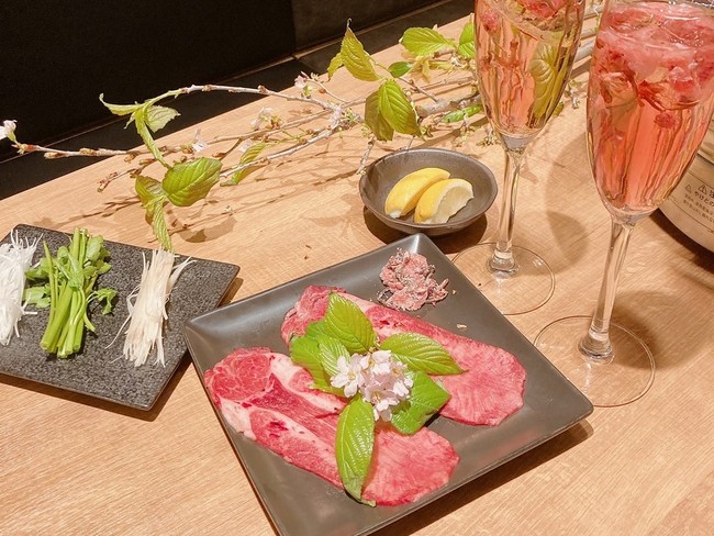 やわらかくてとろける舌ざわりの大判黒タンで塩味含む桜葉と桜花を包んだ当店オリジナルメニュー。口に入れた瞬間に春の息吹が広がります。お席にてスタッフが最高の焼き加減でご提供。季節限定のウエルカムドリンク「SAKURAフィズ」一杯無料サービスも♪