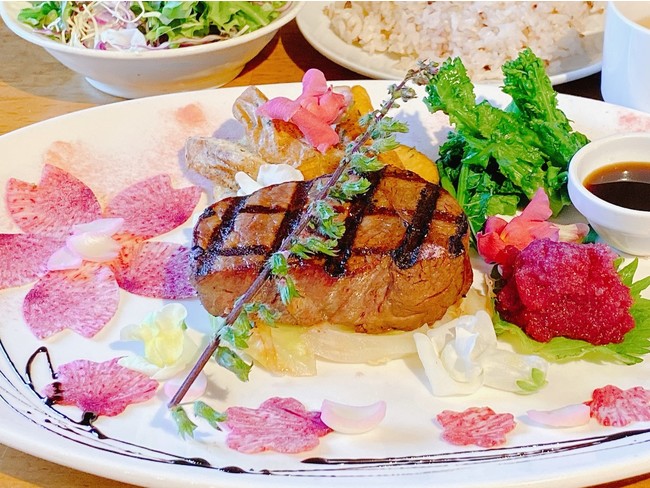 “桜”の彩りが美しい、当店自慢のやわらかいヒレ肉のグリルがランチメニューで登場。菜の花など春野菜とともに、桜型のピンクの大根、桜色の大根おろし、可憐な花びらに桜塩と桜づくしの春の訪れを感じる逸品です。