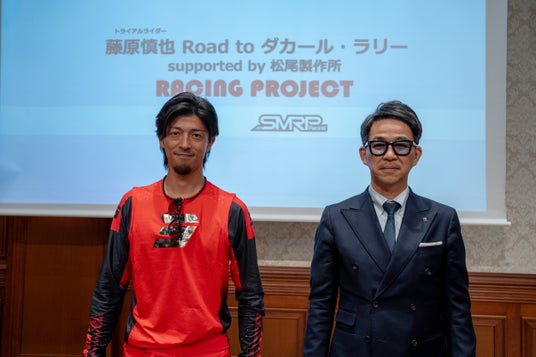 4月に行われた「藤原慎也 Road to ダカール・ラリー supported by 松尾製作所 記者発表会」の模様。写真左から藤原慎也、プロジェクトを強力にサポートする株式会社松尾製作所 取締役 社長 松尾基氏。