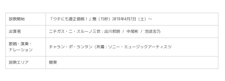 日本瓦斯株式会社(本社:東京都渋谷区 以下「ニチガス」)は、2018年4月7日(土)より新CM「ウチにも適正価格!」篇を放映開始いたします。