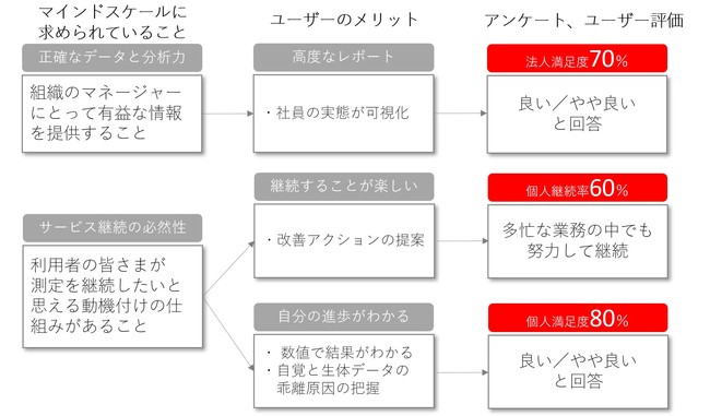 「マインドスケール」は、企業が課題とする従業員のストレス状態の見える化とストレス対応アドバイスを行い、従業員一人ひとりがストレスをマネージするスキルを取得することができるサービスを提供しています。当社は、企業が本プロダクトを導入することで、従業員ストレスの深刻化の回避、ストレス状態悪化に起因する様々なコストの軽減、また、組織の活性化(エンゲージメントの強化)の契機となることを目指しています。