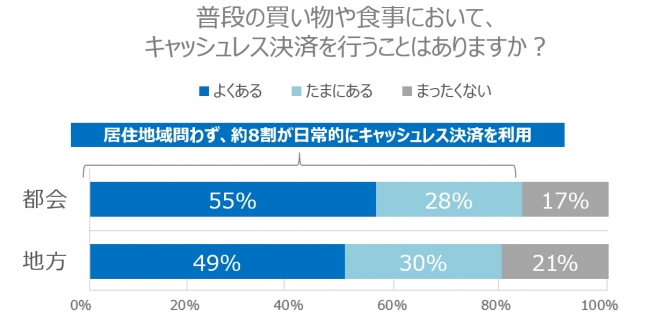 なお、居住地域別にみると、三大都市(東名阪)の周辺地域=都会エリアでは83%(よくある:55%、たまにある:28%)、その他の地域=地方エリアでも79%(よくある:49%、たまにある:30%)という結果に。都会だけでなく、地方においてもキャッシュレス化が進行している様子がうかがえます。