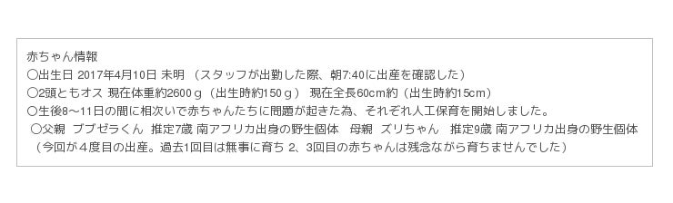 ・ 4/18 2頭の赤ちゃんのうち1頭の体重が増えず、左目の炎症と脱水症状が疑われた為、スタッフ が⺟親から取り上げて人工保育を開始した。